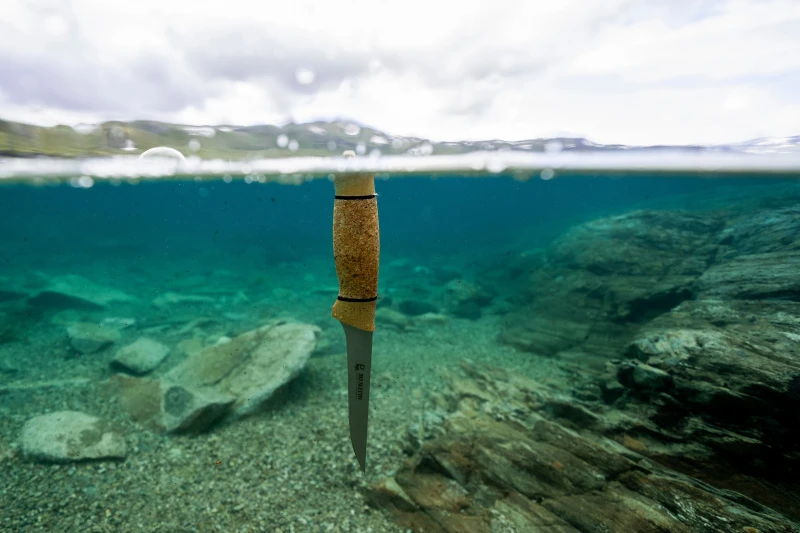 Der Griff des Messers ist durch den Korken und die Flexibilität der Gummieinlage sehr griffig, so dass Sie das Messer auch im nassen Zustand problemlos benutzen können. Der Griff wird durch norwegische Birke stabilisiert, was ebenfalls für ein stilvolles Finish sorgt. Die Klinge ist aus rostfreiem 440C-Stahl gefertigt. Durch die Verjüngung der Klinge und das dünne Design ist das Messer hervorragend zum Filetieren von Fisch geeignet. Mit der Schlaufe im hinteren Teil des Griffs haben Sie außerdem die Möglichkeit, einen Riemen zu befestigen und das Messer nach Ihren Wünschen zu gestalten.Gesamtlänge des Messers: 24 cmKlingenlänge: 12 cmGewicht: 200 GrammMesserstahl: 440CGriffmaterial: geölte Birke, Kork und GummiScheide: Braunes Rindsleder mit SicherheitseinsatzGarantie: Lebenslang gegen Herstellungsfehler