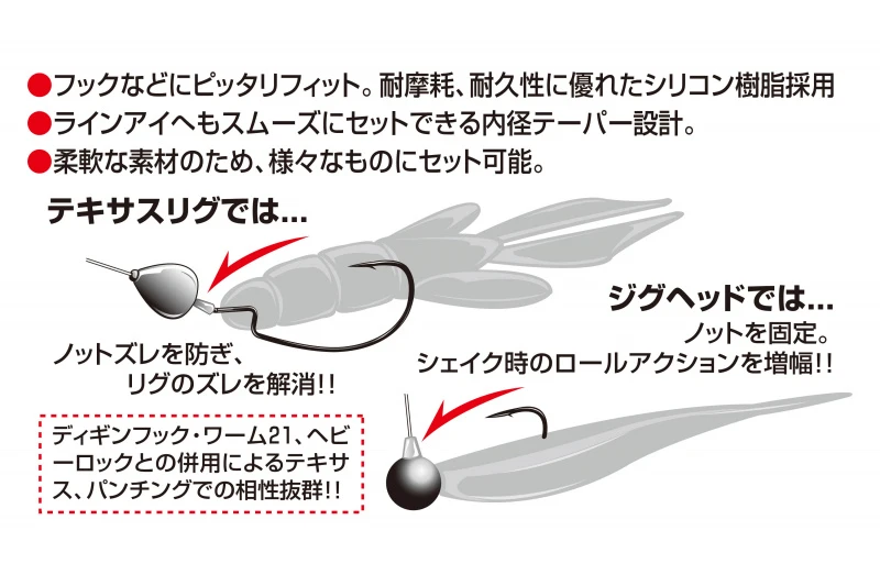 Der auf das Öhr gesetzte Haken und der Jigkopf verhindern Knotenverschiebungen, die beim Werfen auftreten (machen die Richtung der Schnur konstant), und bringen das Potenzial des Wurms zur Geltung. Darüber hinaus können verschiedene Anwendungen bei Salzwasserspielen angewendet werden, wie z. B. Knotenschutz für Ziele mit scharfen Zähnen.’óè Holen Sie die Leistung aus jedem Rig heraus, einschließlich des Texas-Rigs.’óè Die wattlose Leistung des Knotenteils wird verbessert.’óè Vielfältige Anwendungen sind möglich, nicht nur zum Fixieren von Knoten, sondern auch für alle Angelarten wie z.B. Salzwasserspiele, wie z.B. das Fixieren von Haken.’óè Taper-Design für die Innenseite des Auges mit gutem Augenkomfort.’óè Verwendet Silikonmaterial, das sich gut an Haken anschmiegt