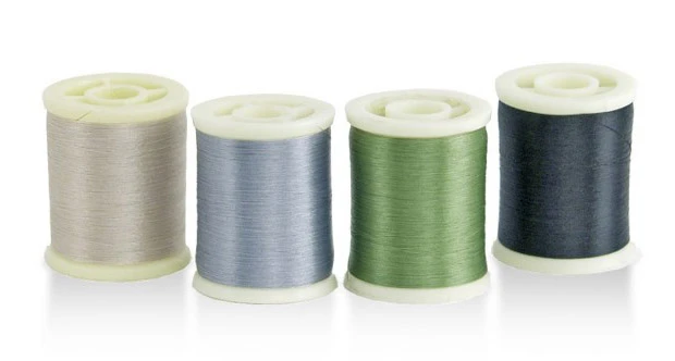 Schönes Paket mit 4 verschiedenen Farben von Faden für Fliegenbinden.#1 Creme – #2 Grau – #3 Oliv – #4 Schwarz (Spule 200m / 219 yards).
